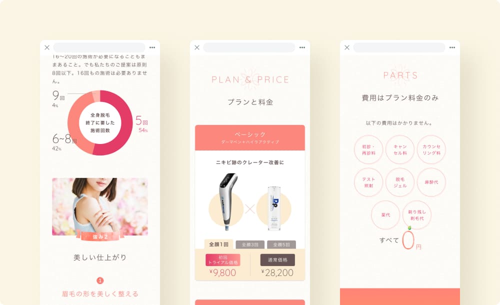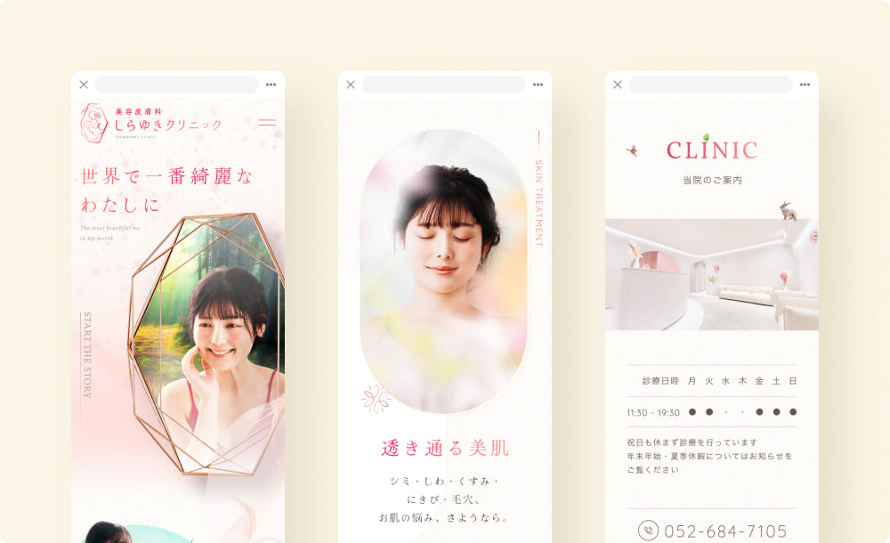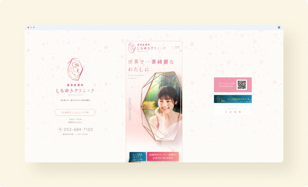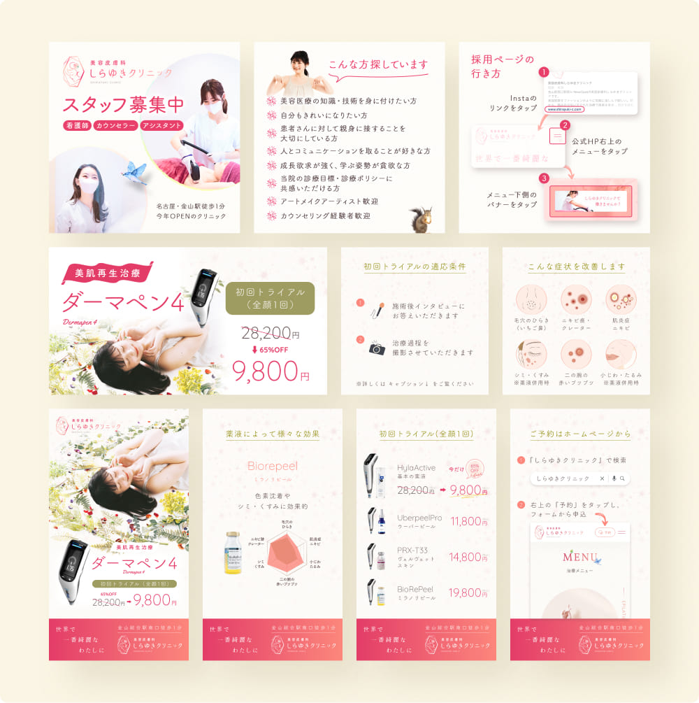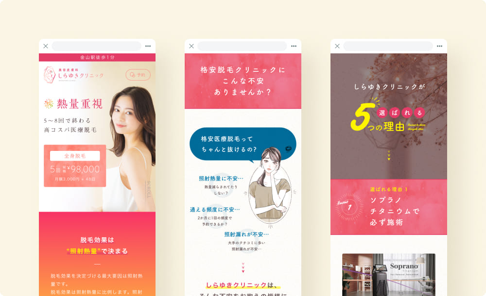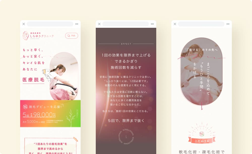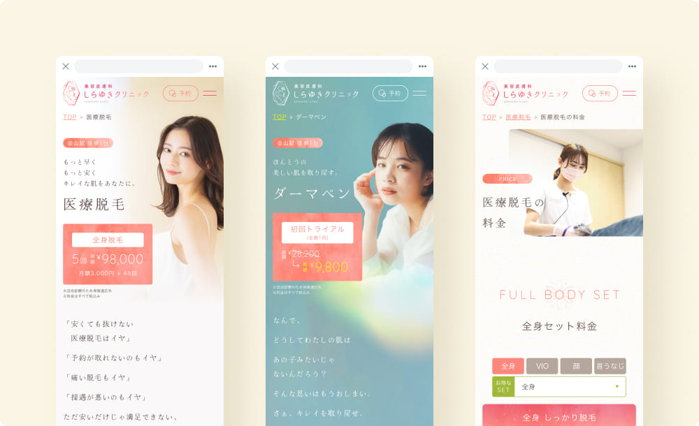 WebサイトやLP、バナー制作においては、誇張表現を避け、料金や施術内容を明快に提示。キャンペーン情報の煩雑化を抑え、余白を活かしたUI設計で、必要な情報に迷わず辿り着ける体験を実現しました。これにより安心感の醸成を目指しました。