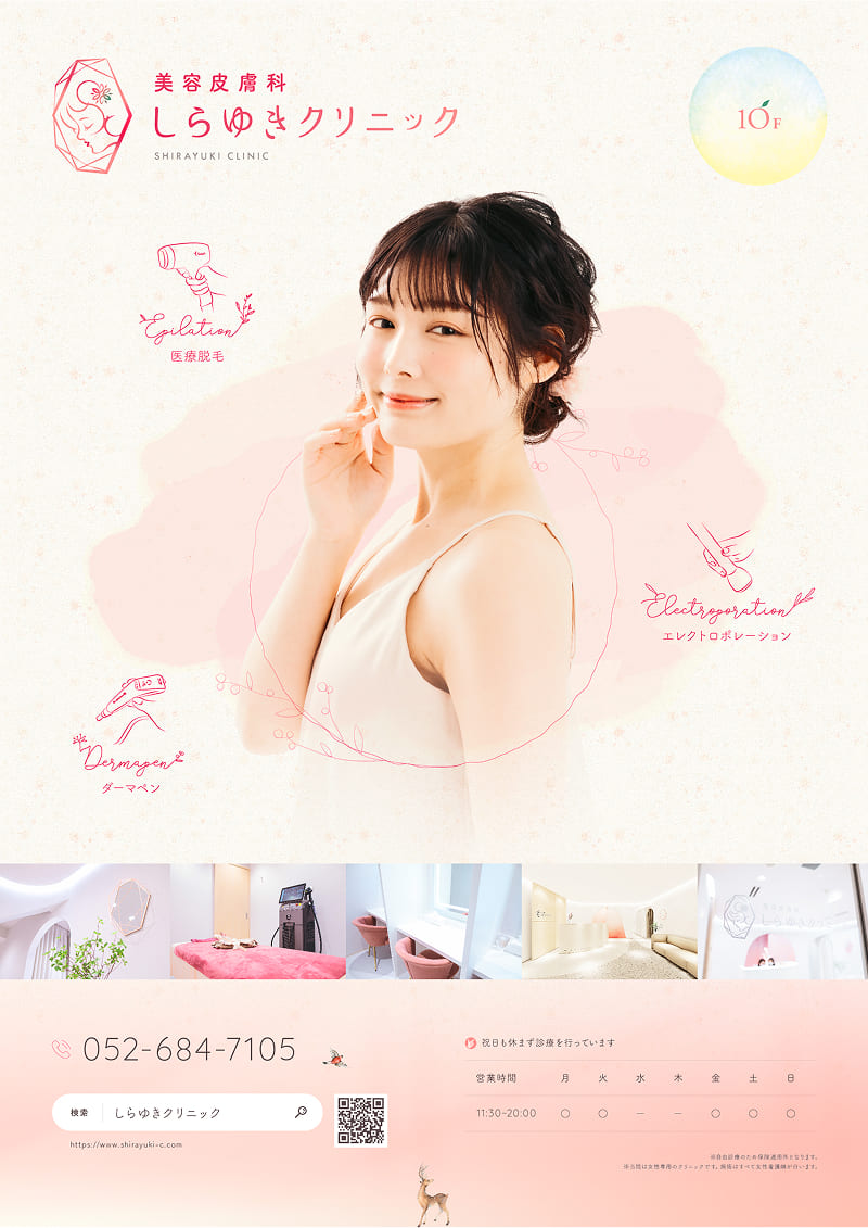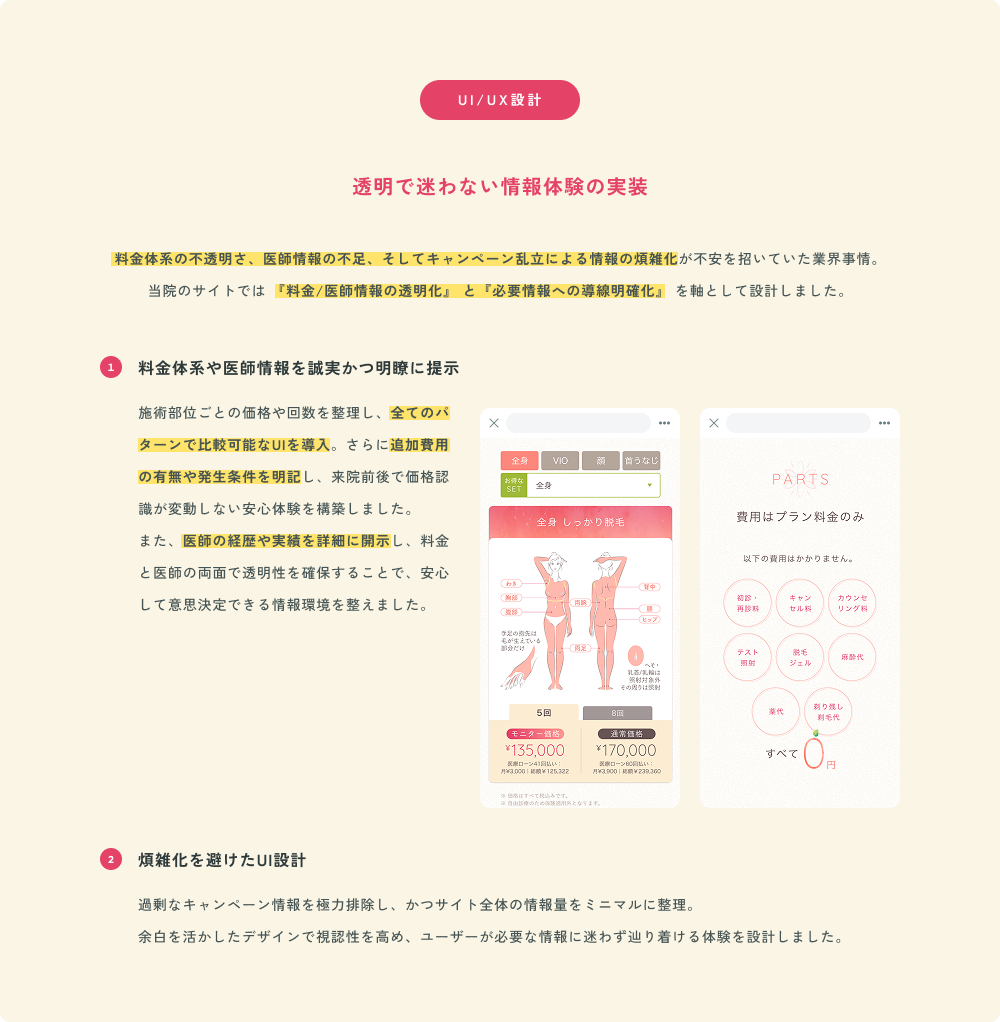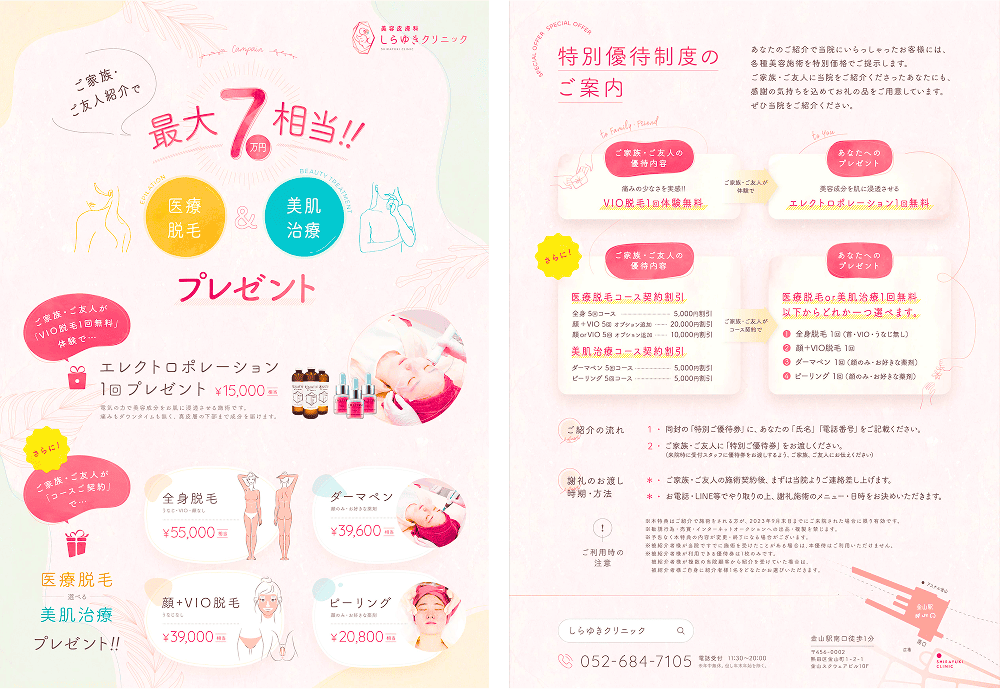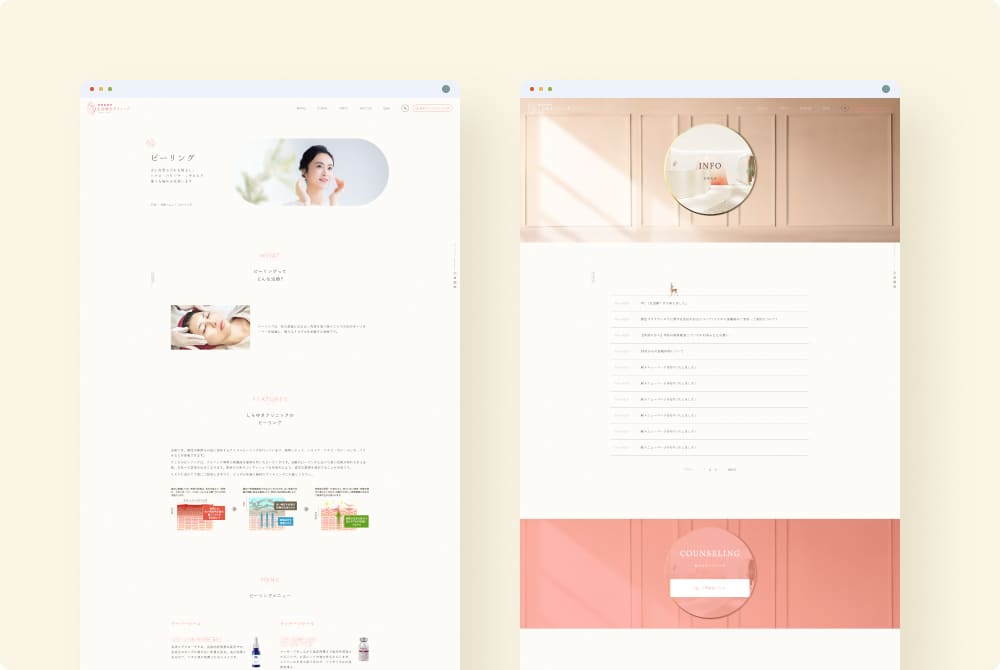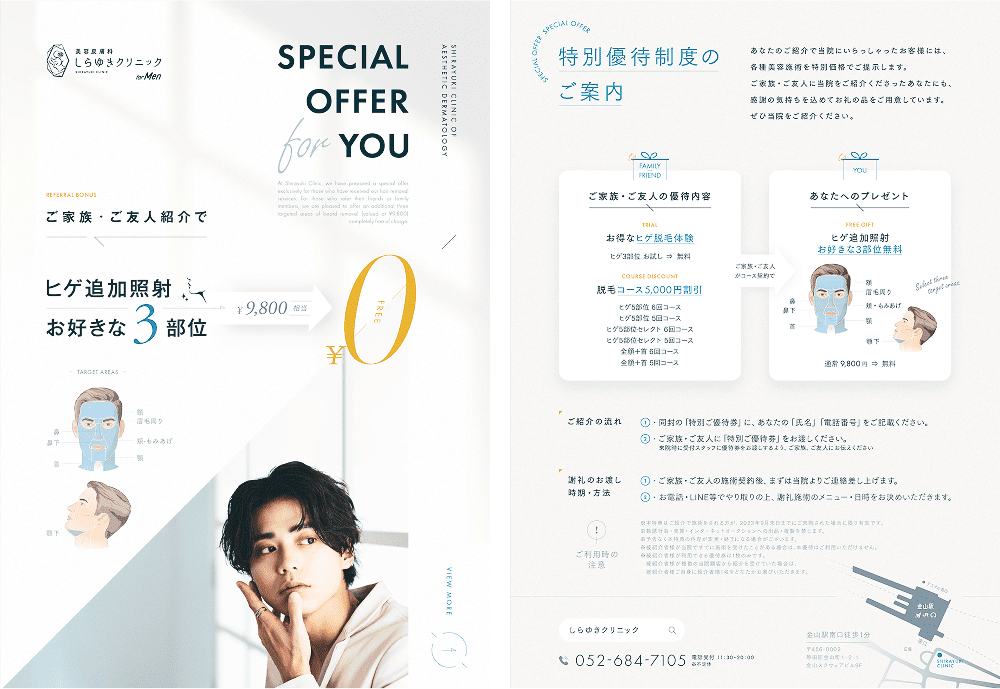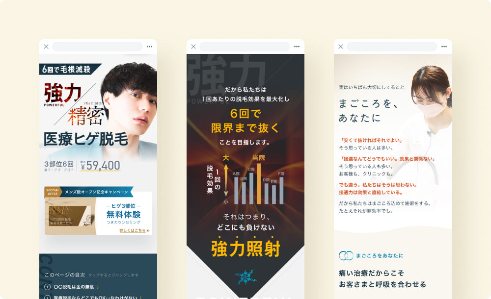 WebサイトやLP、バナー制作においては、誇張表現を避け、料金や施術内容を明快に提示。キャンペーン情報の煩雑化を抑え、余白を活かしたUI設計で、必要な情報に迷わず辿り着ける体験を実現しました。これにより安心感の醸成を目指しました。