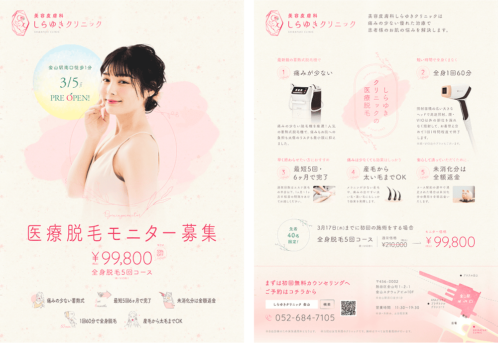 美容医療・医療脱毛市場に新規参入するクリニックの開業支援として、約2年半にわたり経営とマーケティングを包括的に支援。ブランド設計からVI策定、各種媒体のアートディレクション/デザイン、院内体験を含む空間デザインまでを横断的に担当しました。