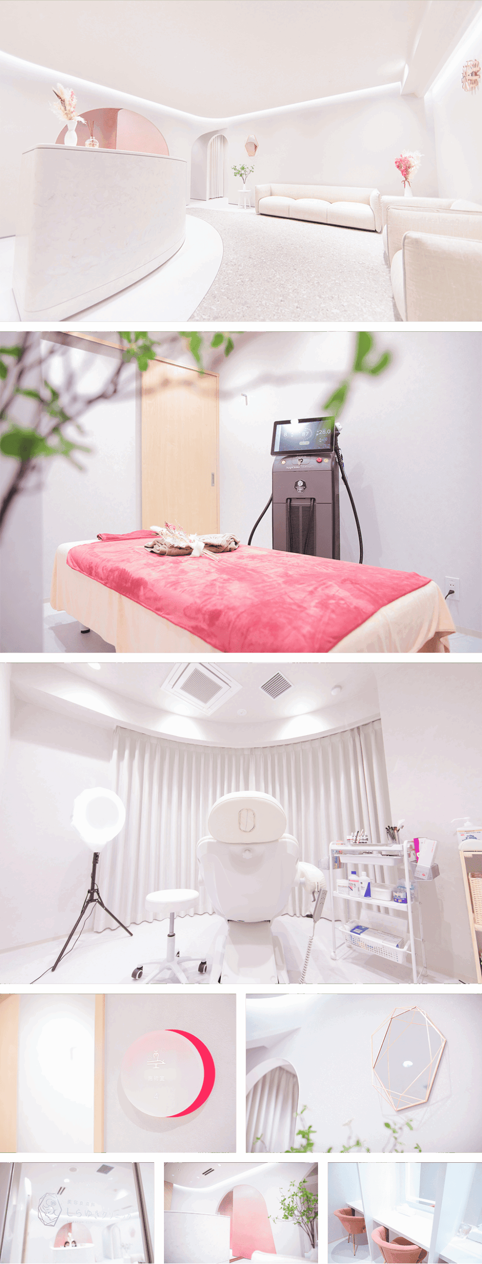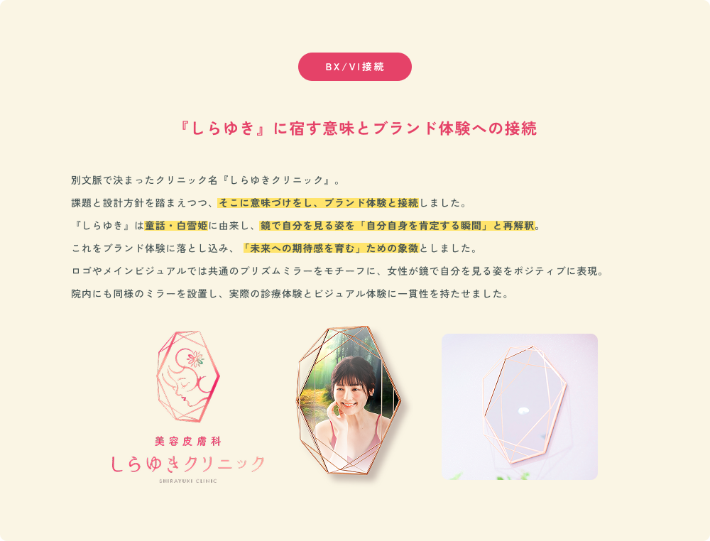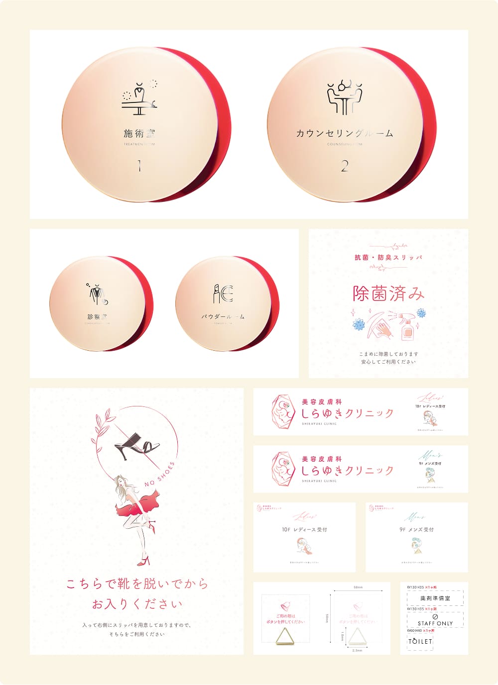 ロゴはプリズムミラーの多角形と女性像を組み合わせ、髪型に「S」「C」を忍ばせたり、「ら」をリンゴに見立てるなど、細部に遊び心を込めたデザインとしました。院内外でブランドを象徴するシンボルとして機能するとともに、「自分自身を肯定する鏡の瞬間」というブランド体験を視覚化しています。