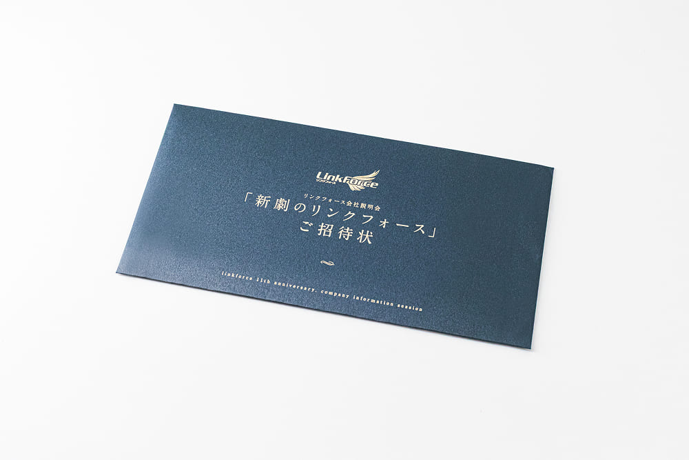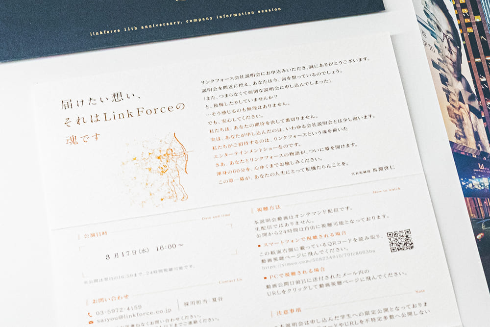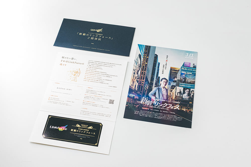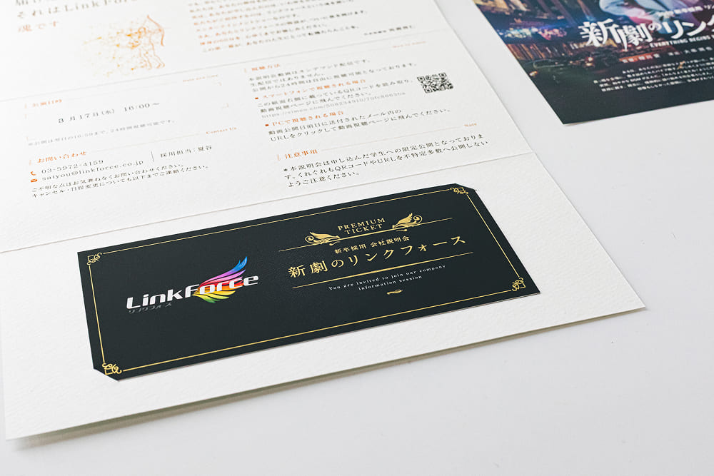 招待状は「舞台のチラシ」と「金箔をあしらった特別感のあるチケット」を厚紙封筒に同封。説明会を劇場体験に見立てることで、参加前から高揚感を持たせるデザインとした。