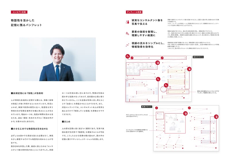このパンフレットはDM封入として隔月で配布され、既存パンフと比較してデザイン変更だけで相談申込率は約1.5倍に増加。論理に基づいたデザインの力を実証する成果となりました。