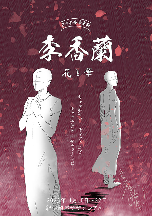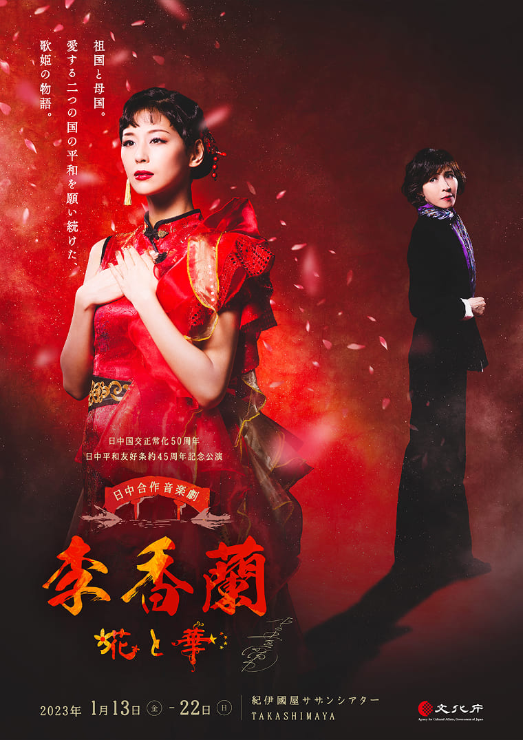 中国と日本、祖国と母国の狭間で揺れ、戦火に翻弄されつつも平和を願い続けた姿を、鮮烈な赤と舞い散る花びらに重ねました。