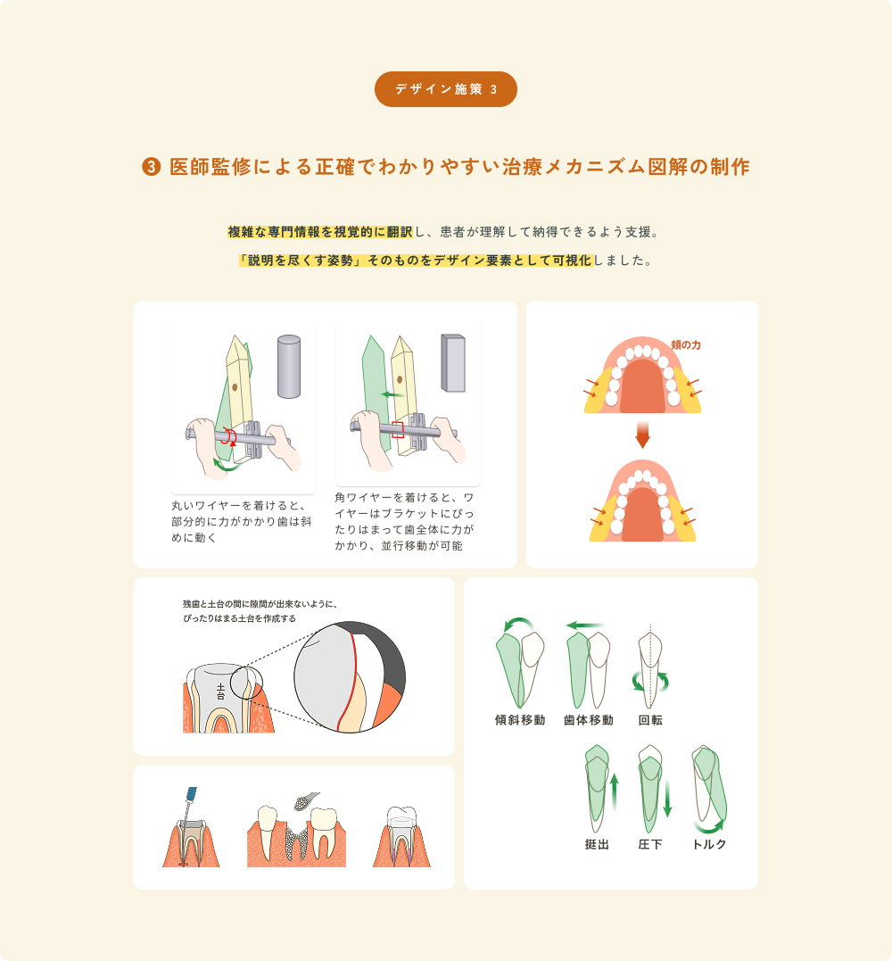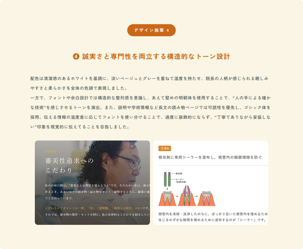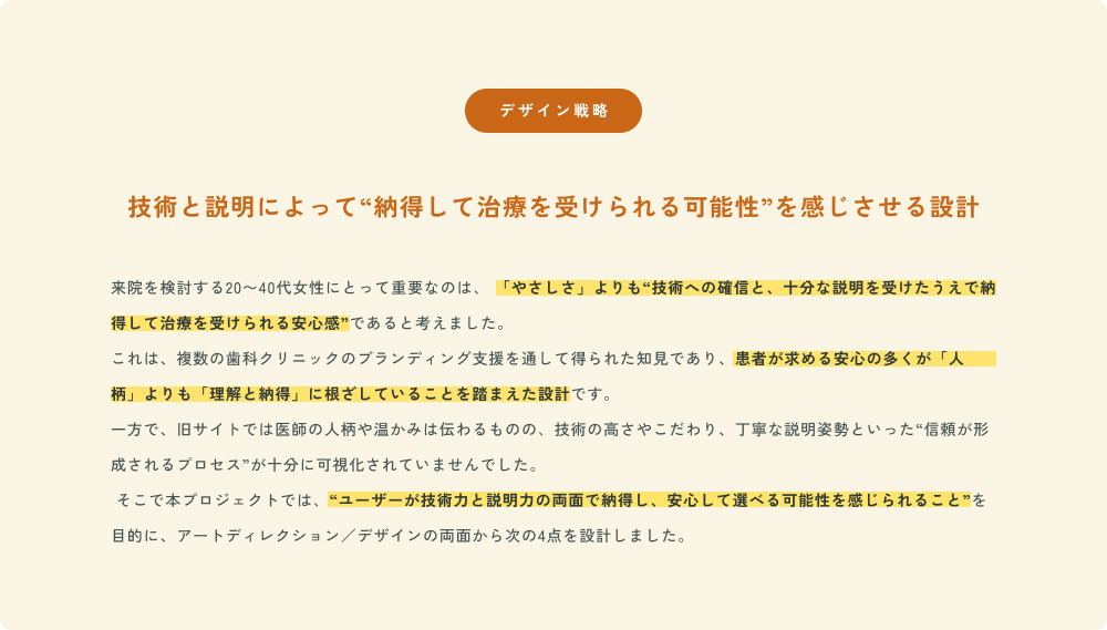 課題は、医師の誠実な人柄は伝わる一方で、来院心理や患者インサイトにおいて重要な、『技術的な確かさや説明力』といった“信頼が形成されるプロセス”が十分に伝達できていなかったこと。これに対し、「理解して納得できる体験」をデザイン面からどう支援できるかを検討しました。