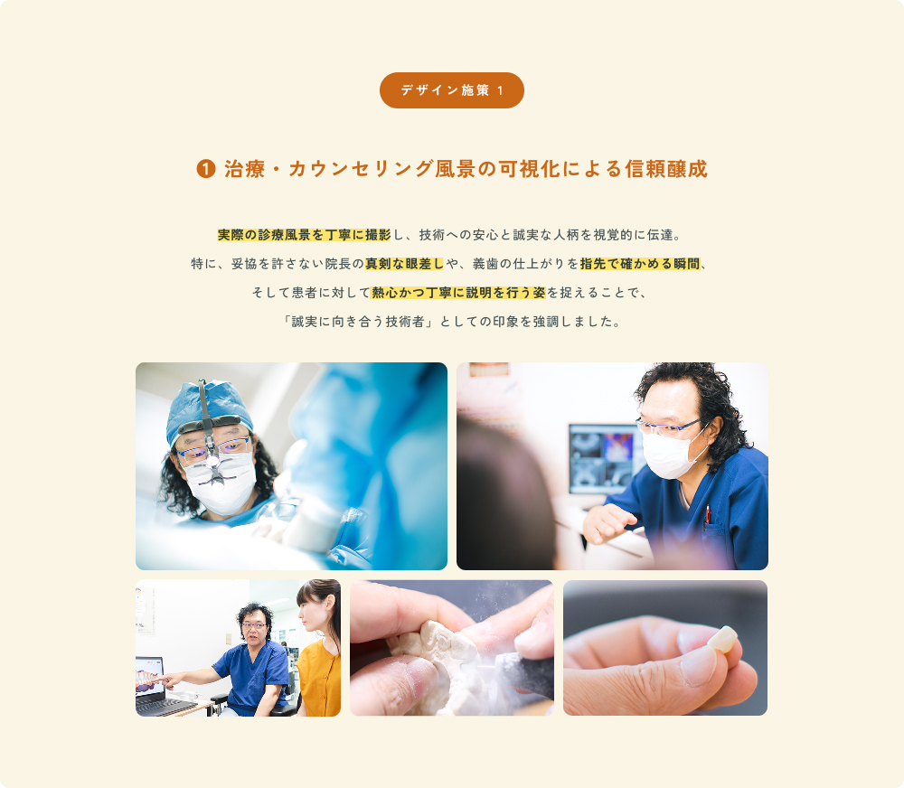 写真・動画の撮影から加工・編集までを担当しました。院長の真剣な眼差しや診療風景を中心に据え、技術力と誠実さが伝わるように仕上げています。