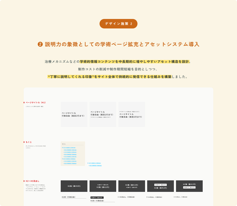 本サイトはページ数が多く複雑なため、配色で階層構造を明確化したり、閲覧中のページに『閲覧中』アイコンを付与したりなど、直感的な理解を助けるUIづくりを意識しました。
