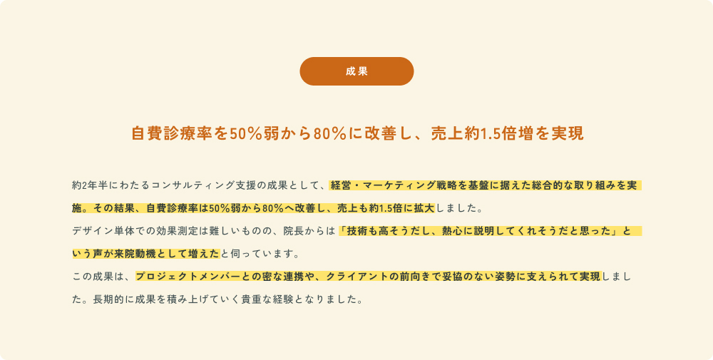 治療・カウンセリング風景の可視化や、学術的な情報を継続的に発信できる仕組み化、医師監修による正確な図解制作、そして誠実さと専門性を両立するトーン設計など、複数の施策を通じて“安心と確信を同時に感じられるブランド体験”を構築。経営・マーケティング戦略を土台に、チーム一丸で課題を解決へ導いた結果、長期的な信頼の醸成とともに、自費診療率・売上の大幅な向上へとつながりました。