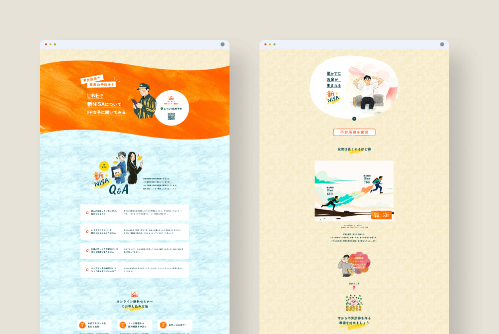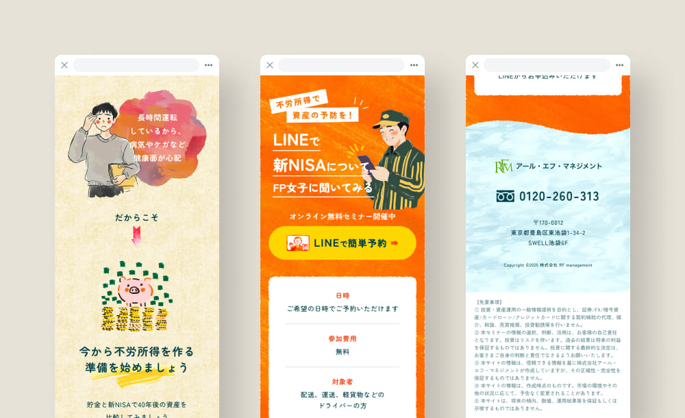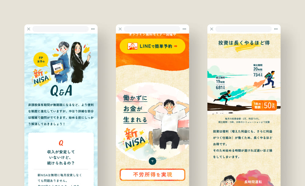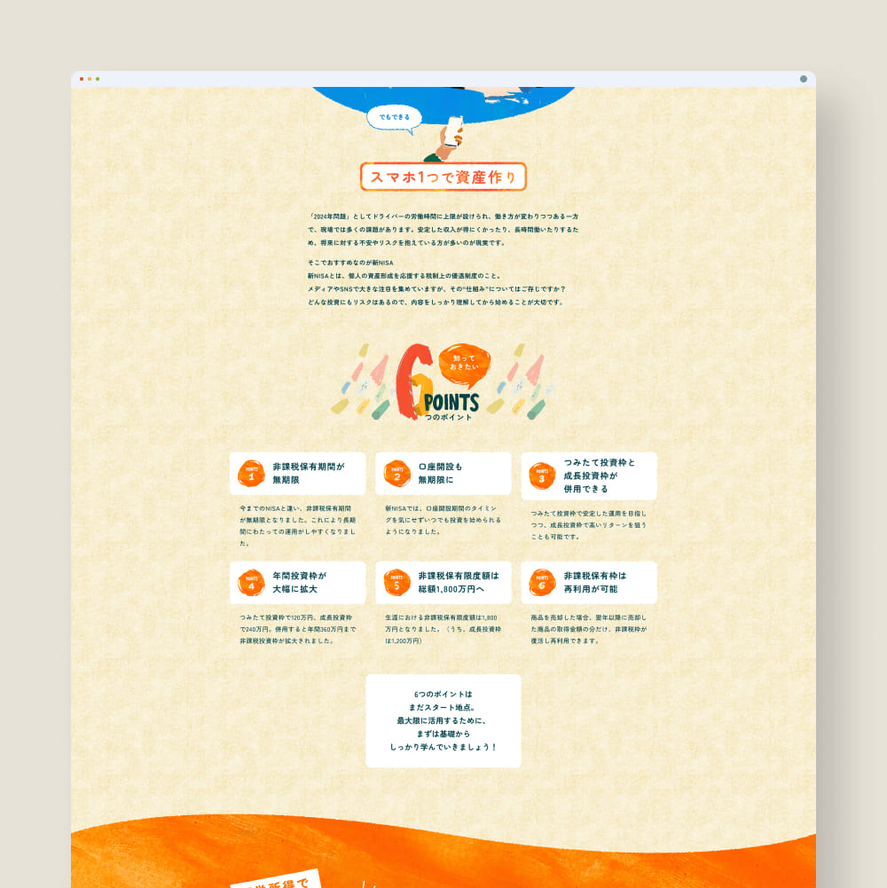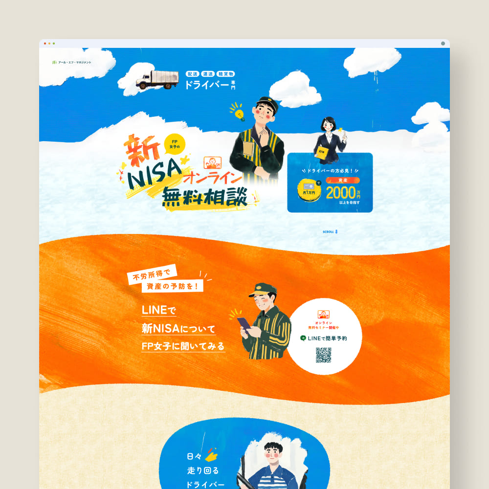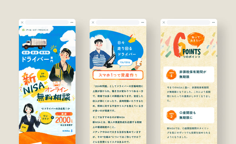 長距離配送ドライバー向けに新NISAを提案するLPデザインを担当しました。仕事の合間や休憩時間にスマホで閲覧されることを想定し、視認性を高めつつ勢いで心を動かせるポップでカラフルなトーンを採用しました。疲れている中でも前向きな活力を感じられるようにしつつ、過剰な押し付けを避けるため、ラフなテクスチャや手描き風の余白を残し親しみやすさを付与。全てのイラストはAIで生成し、デザイン全体に独自性を持たせました。