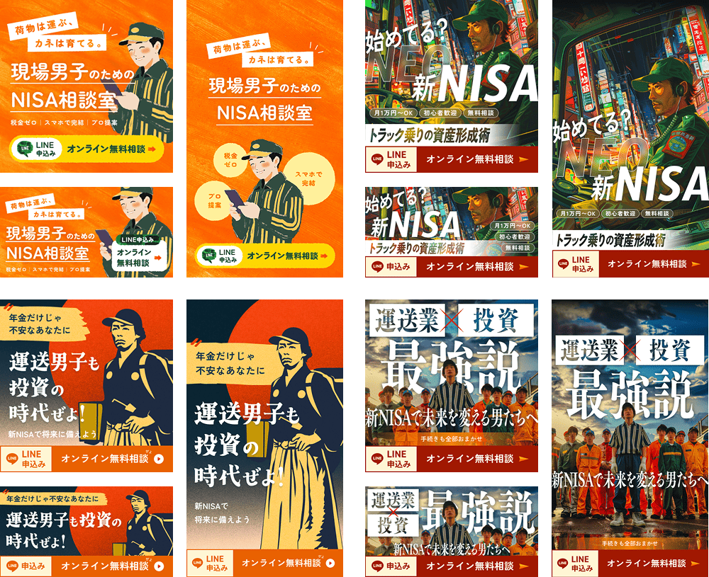 バナーは認知と興味喚起を最優先とし、スマホ上で目に留まりやすい大胆なビジュアルやレイアウトを意識しました。ビジュアル制作はLPと同様にAIを活用し、短時間で多様な表現を展開しています。